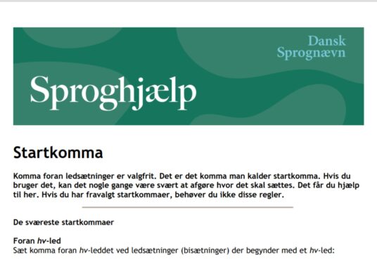 Du må selv vælge om du sætter startkomma eller ej – bare du er konsekvent indenfor samme tekst. Tidligere anbefalede Dansk Sprognævn at man altid undlod at sætte startkomma, men i 5. udgave af Retskrivningsordbogen, der udkom i 2024, er anbefalingen taget ud. Selvom anbefalingen er taget ud, er det stadig valgfrit at sætte startkomma – bare du er konsekvent indenfor samme tekst.